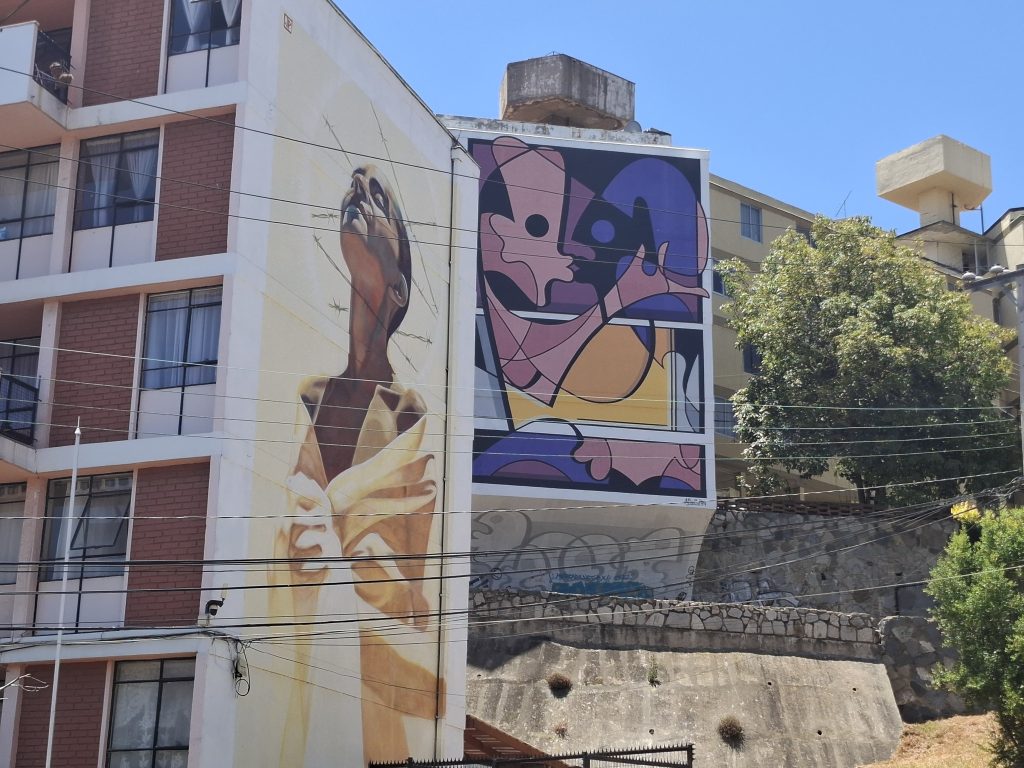• Murales y grafitis con ilustraciones, formas orgánicas y mensajes poéticos.