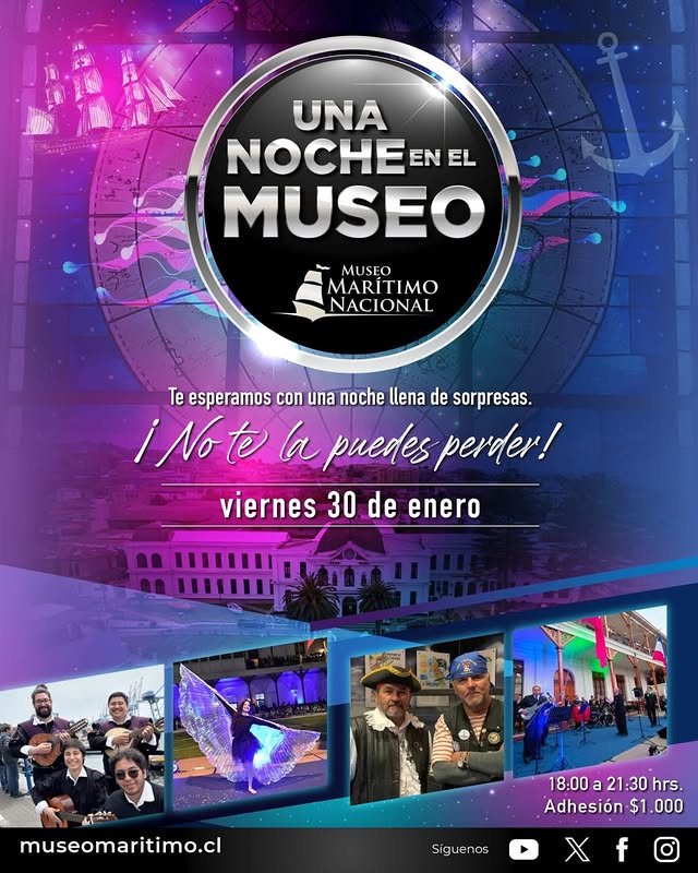 El Museo Marítimo Nacional abre sus puertas en horario nocturno para vivir una experiencia única llena de sorpresas, historia y cultura. Una Noche en el Museo invita a recorrer sus salas y espacios patrimoniales en un ambiente distinto, con actividades especiales pensadas para todo público y una atmósfera que combina patrimonio, arte y entretención.